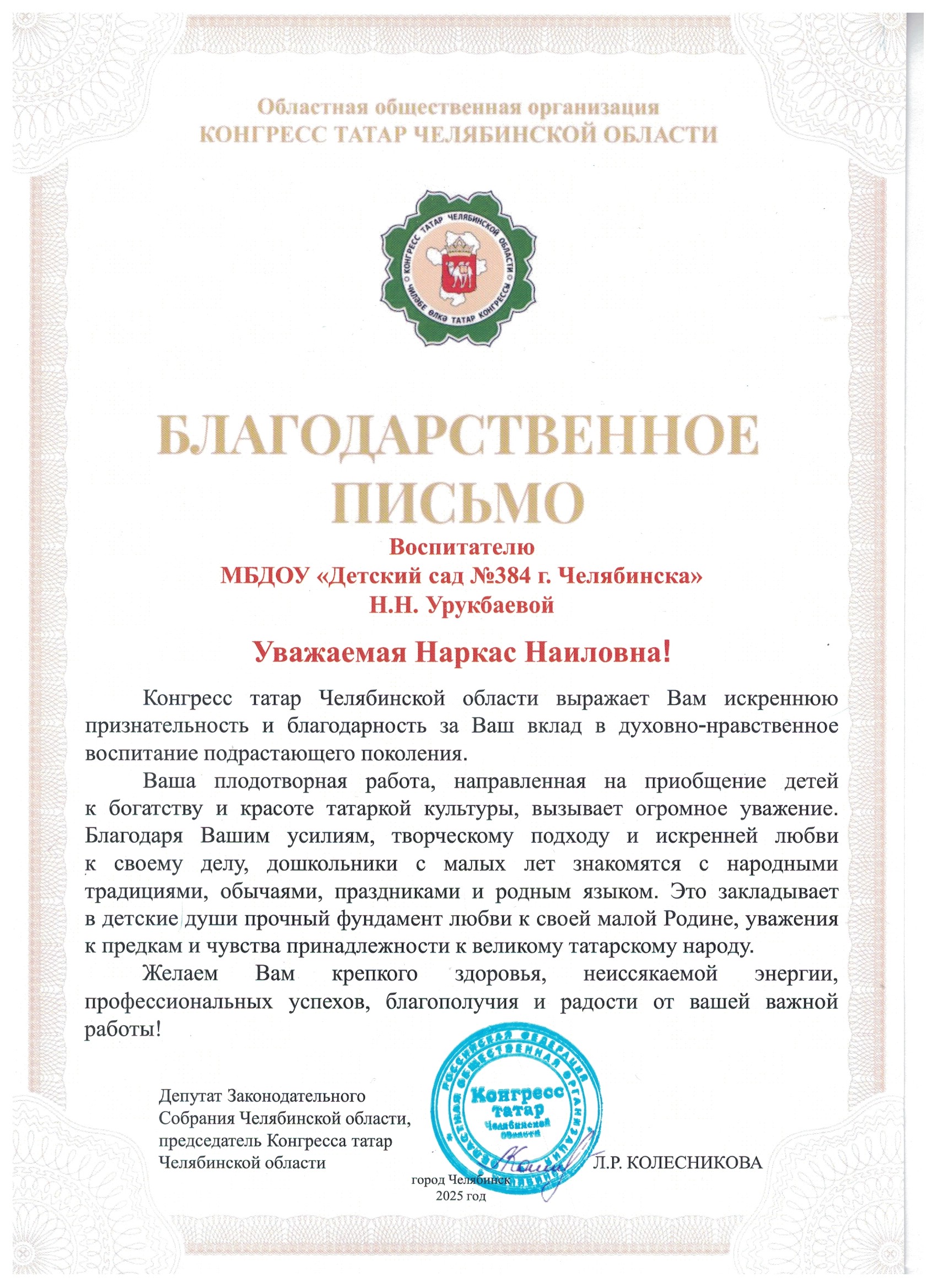 Каримову Викторию и ее наставника Урукбаеву Наркас Наиловну.